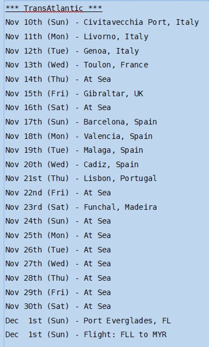 - Cruise: Nov 10, 2019 to Dec 1, 2019 - Itinerary & Map
